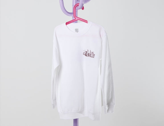 White sweater with Doha skyline maroon print, soft and comfortable for everyday wear.